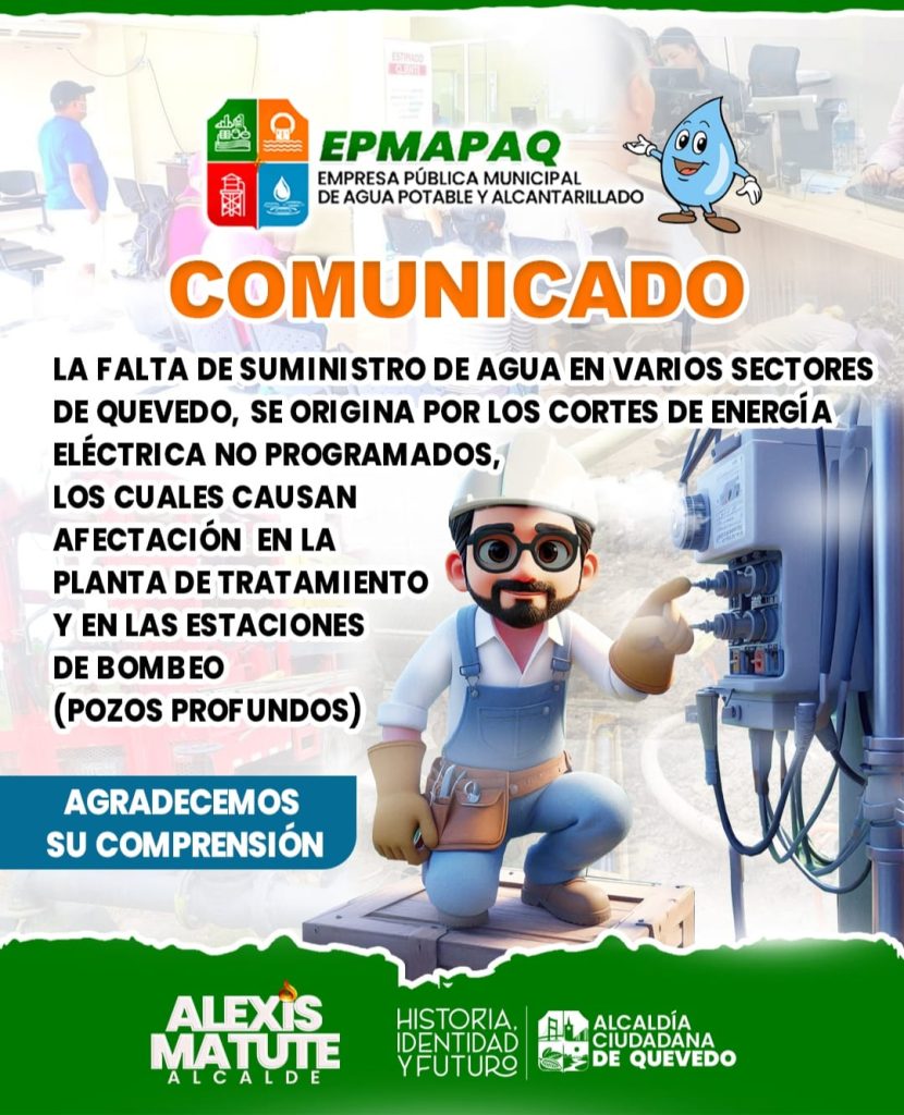 La falta de suministro de agua en varios sectores de Quevedo se origina por los cortes de energía eléctrica no programados